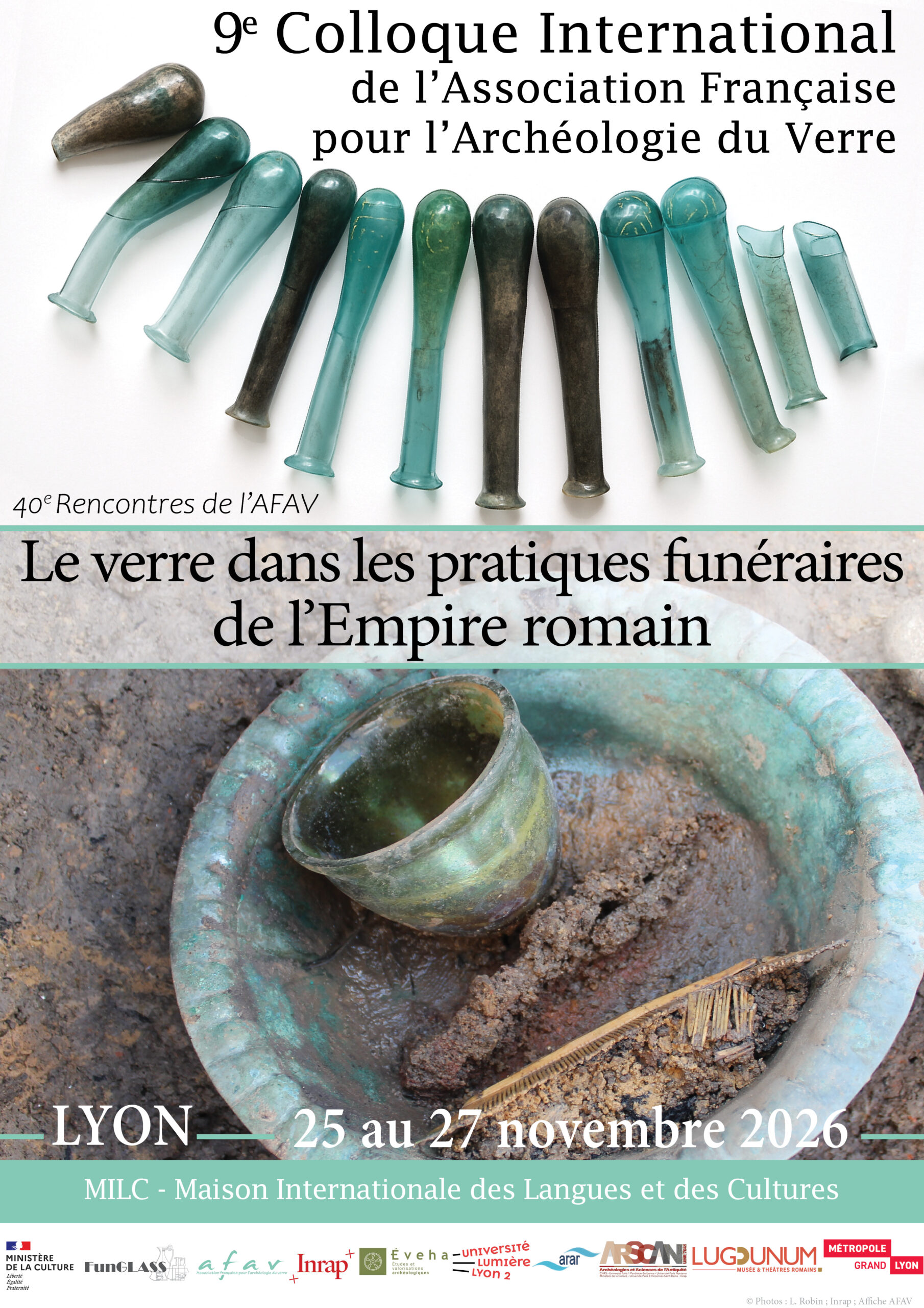 Le 9ème colloque international de l’Association Française pour l’Archéologie du Verre (AFAV) se tiendra à Lyon du 25 au 27 novembre 2026 et portera sur le thème : Le verre dans les pratiques funéraires romaines de l’Empire romain. Cet événement a pour objectif d’examiner la place et le rôle du verre, notamment de la vaisselle, dans les rituels funéraires romains entre le Ier et le IVe siècle apr. J.-C.
